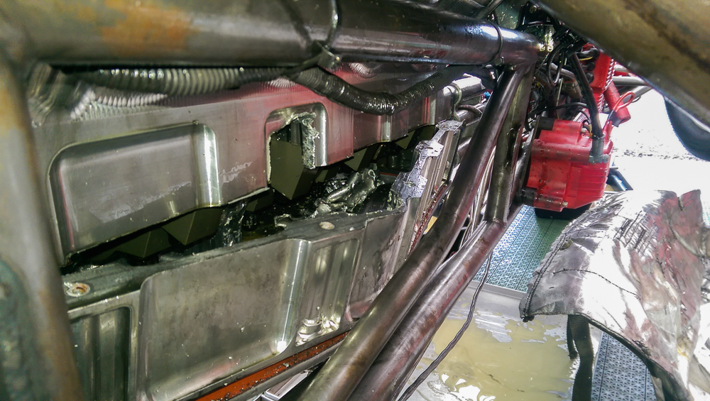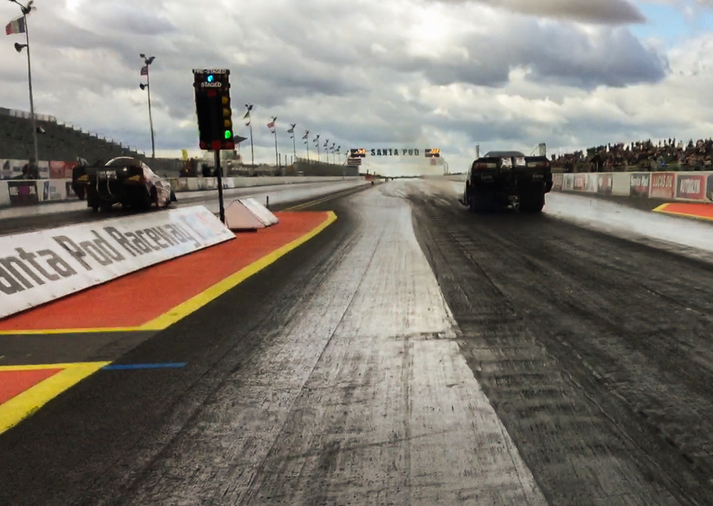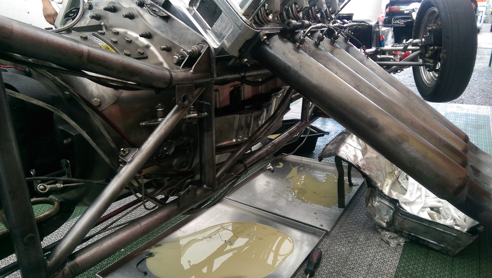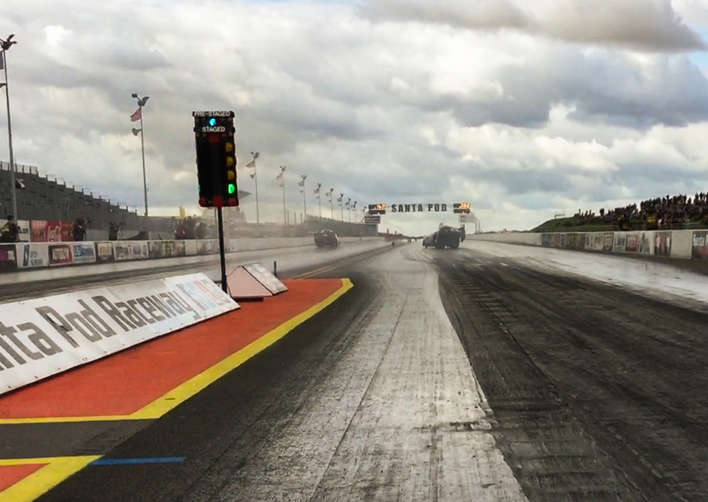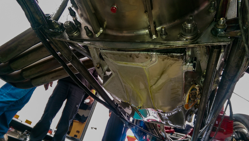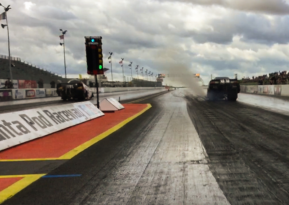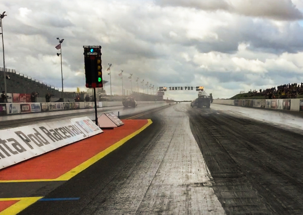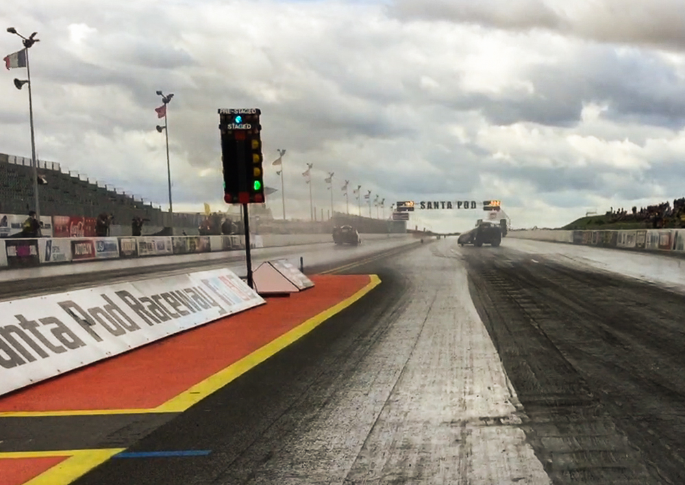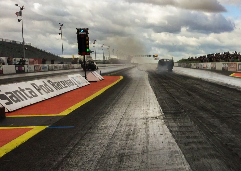 So geschehen in England, Santa Pod bei den Finals 2015. Wie immer nach dem Burn Out rein ins Stage und dann geht alles ganz schnell. Noch vor der 60 Fuß Markierung Qualm auf der linken Seite, Öl unter den Hinterrädern, quergestellt und das war es.